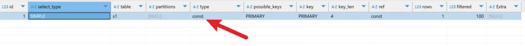 (2) const:基于聚簇索引或者非空的唯一二级索进行定位数据,时间复杂度为O(1),这种高速的常量级查询我们就可以称为const
