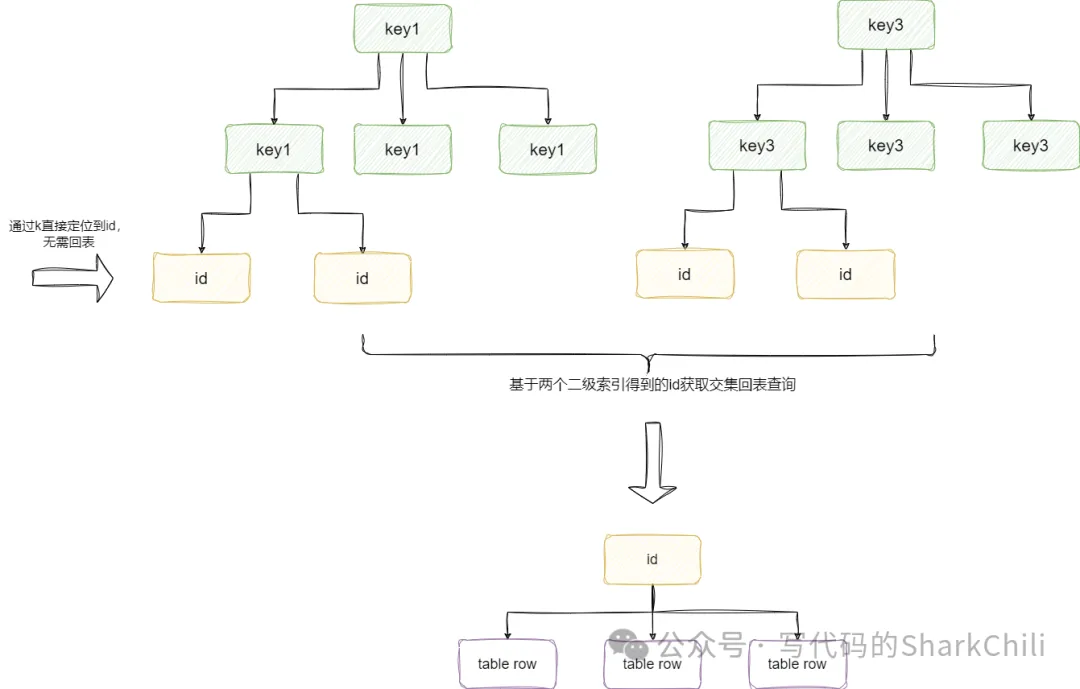 range:范围查询index_merge:索引合并,即进行SQL查询时对应的条件都是索引类型,SQL优化器进行查询时让两个索引分别到自己的二级索引树拿到有序的id集合然后取交集得到聚簇索引值进行回表对应的SQL如下,可以看到我们查询条件都走了索引,查询结果是基于多个索引的扫描区间共同构成的聚簇索引,然后取并集进行回表: