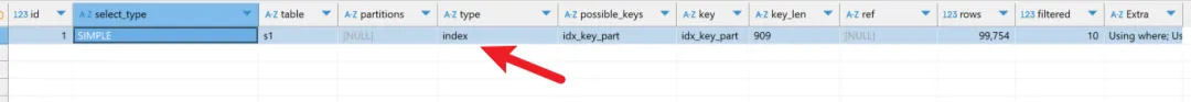 (9) index:进行SQL查询时,基于二级索引全扫描但无需回表的访问方法就是index,这里我们给出一个比较特殊的例子,可以看到这条SQL查询条件是key_part2(即联合索引由key_part1、key_part2、key_part3构成的联合索引),虽然不符合最左匹配原则,但是在MySQL8.0版所提供的Index Skip Scan即索引跳跃这一特性的支持下,这条SQL的执行计划也是显示走index的: