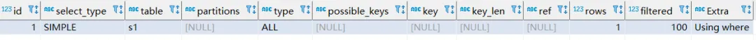 我们先说个简单的例子,针对下面这句单表执行的语句,它就只有一行数据,所以就只有一个id为1的执行计划: