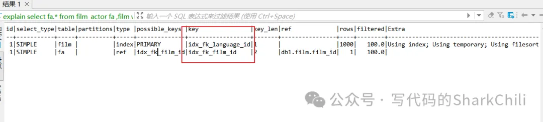 Using filesort:即代表SQL查询时用到了文件扫描,使用了外部的索引进行排序,并没有用到我们自己定义的索引,性能较差。using index:这种方式性能就不错了,使用了索引并且不需要回表就得到了我们需要的数据,即用到了索引覆盖。Using temporary:MySQL查询排序时使用了临时表性能较于filesort更差。using where:即代表查询时仅仅用到了普通的where条件,并没有用到任何索引,查询需要在server层进行判断。Using join buffer:在进行连接查询时,被驱动表的数据定位并没有走索引,于是将驱动表的数据放入缓冲区进行关联匹配。impossible where:说明where条件基本得不到需要的结果,筛选数据时一直处于false的状态。6. possible_keys(可能用到的索引信息)表示当前查询可能用到的索引。如下这个执行计划,它就以为着可能用到了主键