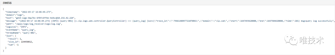 时间戳,日志级别,线程名,类名,eventName,和自定义字段将被日志采集Agent解析后和其他元数据如域名,容器名或主机名一起以JSON格式上报。