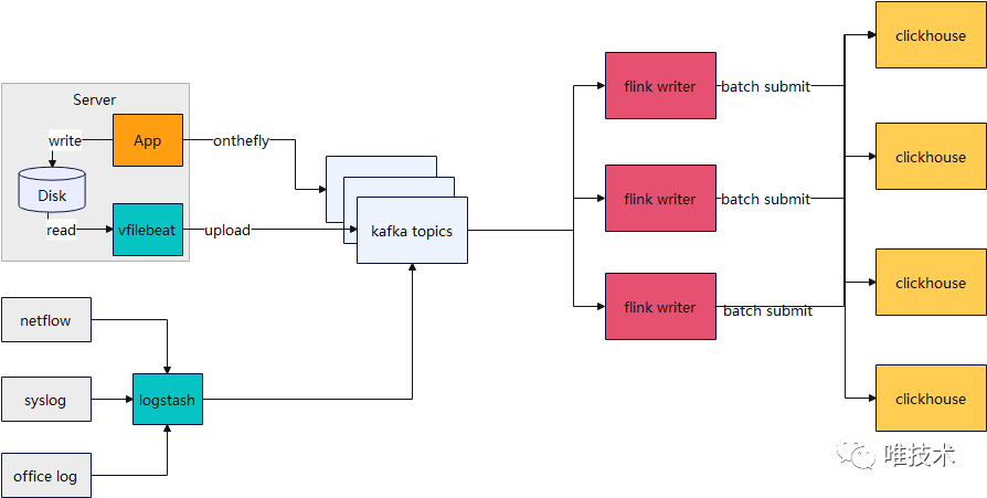 采集到kafka的日志将被一个flink writer任务实施消费后再写入到clickhouse集群。