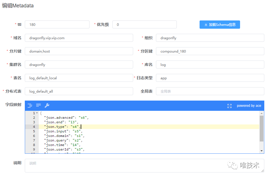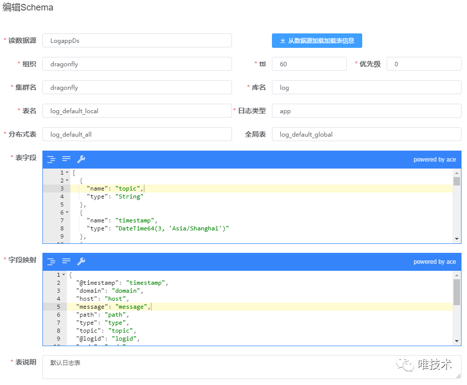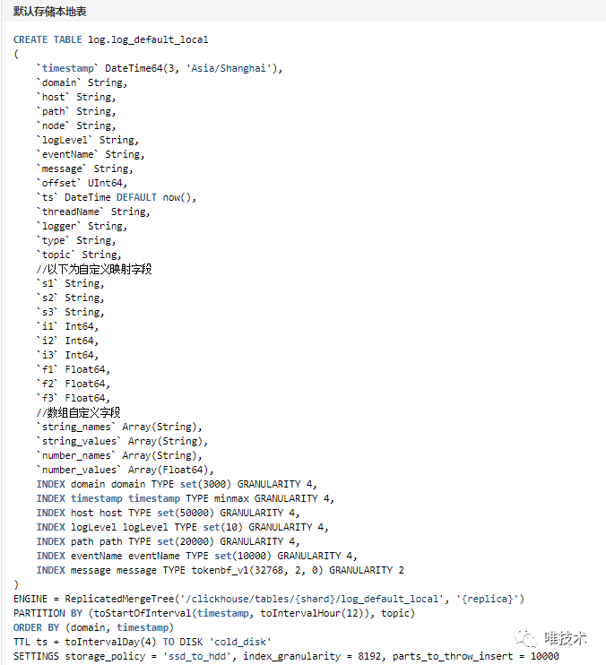 转换操作从schema和metadata表读取域日志存储的元信息,schema定义了clickhouse本地表和全局表名,字段信息,以及默认的日志字段和表字段的映射关系。metadata定义了域日志具体使用的schema信息,日志存储的时长,域分区字段值,域自定义字段映射到的表字段,通过这些域级别的配置信息,我们做到可以指定域存储的表,存储的时长,超大日志域独立分区存储,降低日志合并的CPU消耗。自定义字段默认是按照数组存储,有些域打印的自定义日志字段较多,在日志量大的情况下,速度较慢,配置了自定义映射物理字段存储,可以提供比数组更快的查询速度和压缩率。