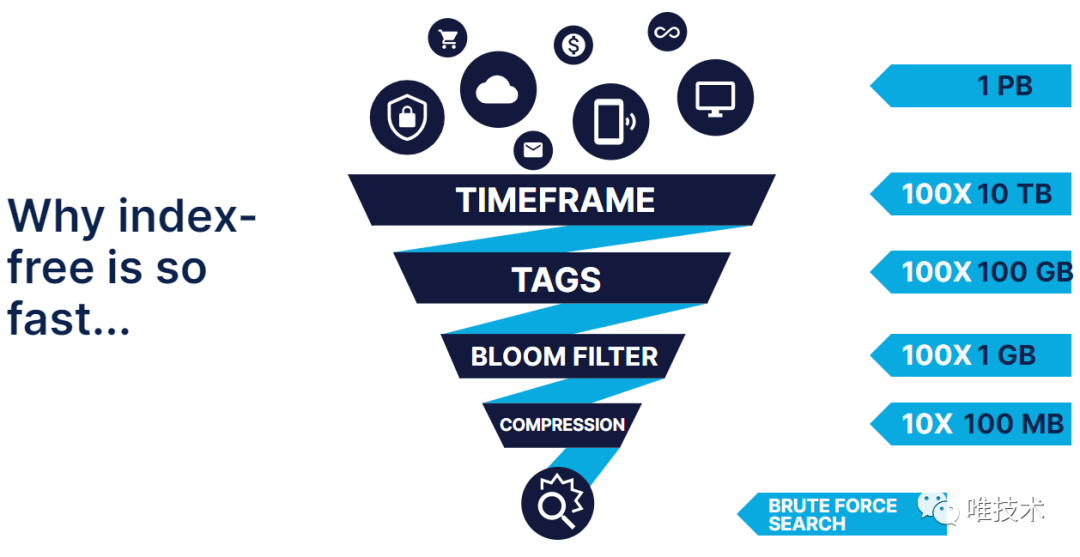 很多次,我和别人解释为什么日志系统没有(全文索引)仍然这么快的原因时,我都直接丢出这张图,图源自商用产品Humio公司的网站,也是我们老板多次推荐我们学习参考的一个产品,2021年初已被CrowdStrike以4亿美元收购。