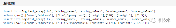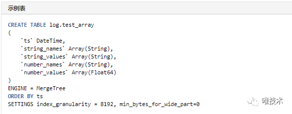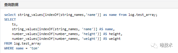 后来借鉴了Uber日志存储的方案,每种数据类型的字段,分别创建两个数组,一个保存字段名称,另一个保存字段值,名字和值按顺序一一对应,查询时,使用clickhouse的数组检索函数来检索字段,这种用法支持所有的Clickhouse函数计算。