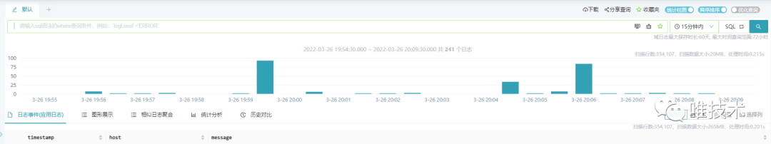 Clickhouse一次执行一条语句,日志查询时柱状图和TOP示例日志是两条语句,会使得查询时间范围翻倍,参考携程的优化方法,查询详情时,我们会根据柱状图的结果,将时间范围缩小至TOP条记录所在的时间区间。