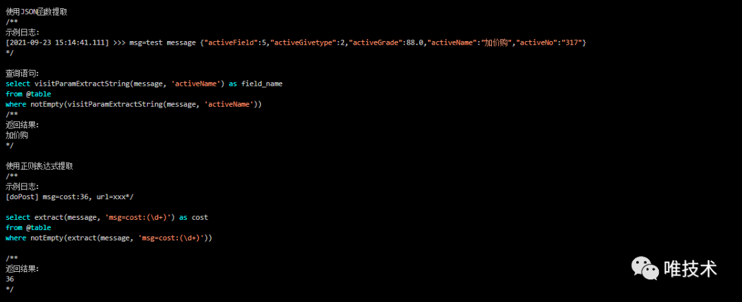 Clickhouse丰富的查询语法,让我们新日志系统的查询分析功能非常强大,从海量日志提取关键字,非常容易,下面列举两个查询用法: