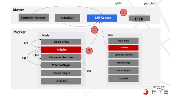API Server:承担集群的网关,实现统一认证鉴权对外服务,同时也是管理Node/Pod资源代理通道;Scheduler:资源调度器,除了Kubernetes默认的调度器,也支持自定义调度器;ETCD:集群状态统一存储,与Zookeeper类似的key-value存储;Controller Manger:控制管理器实现自愈、扩容、应用生命周期管理、服务发现、路由、服务绑定等能力;Kubernetes默认提供Replication Controller、Node Controller、Namespace Controller、Service Controller、Endpoints Controller、Persistent Controller、DaemonSet Controller等控制器。2、分布式的工作节点分布式的工作节点,工作节点运行业务应用容器;默认会运行三大核心组件: