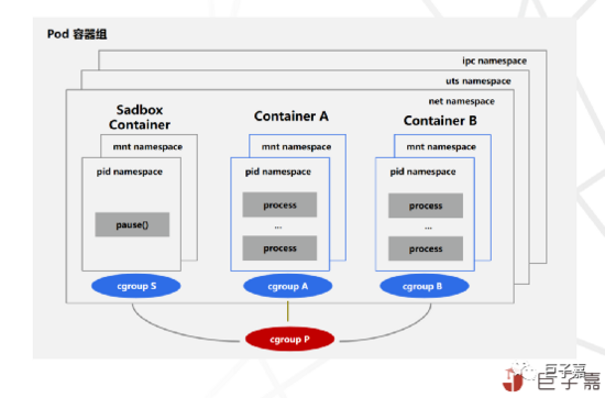 Pause Container:又叫Infra Container,Pod通过Pause Container实现Pod多个容器网络共享,Pause Container最先启动并绑定Pod唯一IP地址与各种网络资源,其他容器通过加入Pause Container的Network namespace来实现网络共享。Pause是C语言实现,镜像非常小只有700KB左右,并且永远处于Pause(暂停)状态;官方镜像是gcr.io/google_containers/pause-amd64:3.0,同时也支持自定义。Init Container:Pod中可以自定义一个或者多个Init Container,按照顺序依次启动,在应用Container之前启动并执行一些辅助任务,比如执行脚本、拷贝文件到共享目录、日志收集、应用监控等。将辅助功能与主业务容器解耦,实现独立发布和能力重用。除了不支持Readiness Probe,其他与特性与普通容器保持一致。App Container:Pod真正承接业务的Container,一般情况会独立运行,如果是有微服务治理等需求会搭配Sidecar Container一起运行。在Init Container启动完成之后,App Container会并行启动,但是需要等待所有App Container处于就绪状态,整个Pod才算启动成功。从POD的资源隔离来看,Pod容器主要由Linux提供的Namespace和Cgroup能力实现的,Namespace实现进程间隔离,Cgroup实现进程资源控制;其中Namespace由ipc 、uts 、net 、mnt 、pid 各种资源空间联合组成。