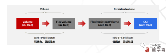 2、Volume存储卷,Kubernetes复杂的存储架构存储非常重要关键,同时也是生态与技术都比较复杂的领域,就linux、window两个生态支持的文件系统就多达20+。对于Kubernete存储架构设计一直在持续演进完善,为了尽可能多地兼容各种存储平台,Kubernetes以in-tree plugin的形式默认对接很多不同类型的存储系统;同时也支持基于FlexVolume和CSI插件以out-of-tree plugin来实现自定义存储服务。