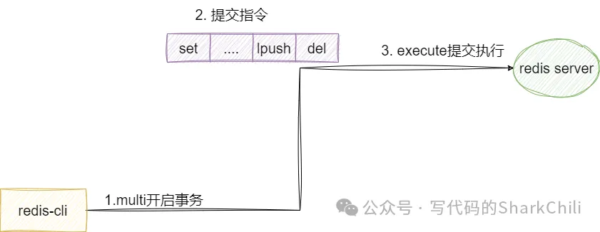 multi:开启事务exec:执行事务discard:取消事务通过multi,当前客户端就会开启事务,后续用户键入的都指令都会保证到队列中暂不执行,当用户键入exec后,这些指令都会按顺序执行。 需要注意的是,若开启multi后输入若干指令,客户端输入discard,则之前的指令通通取消执行。