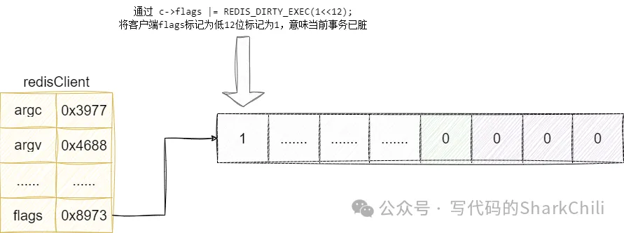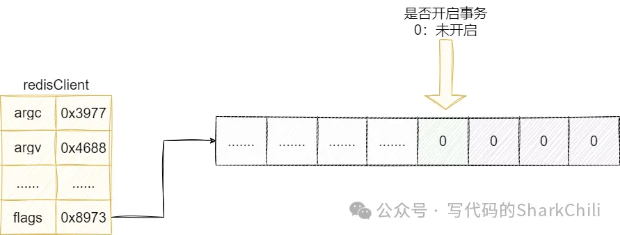 这一点我们也可以从源码的角度分析,redis会为每一个redis客户端分配一个结构体维护其内部信息,这其中flag字段就代表着客户端各种状态标识,这其中低3位就表示客户端是否开启事务标识,如果1就代表开启,反之代表未开启: