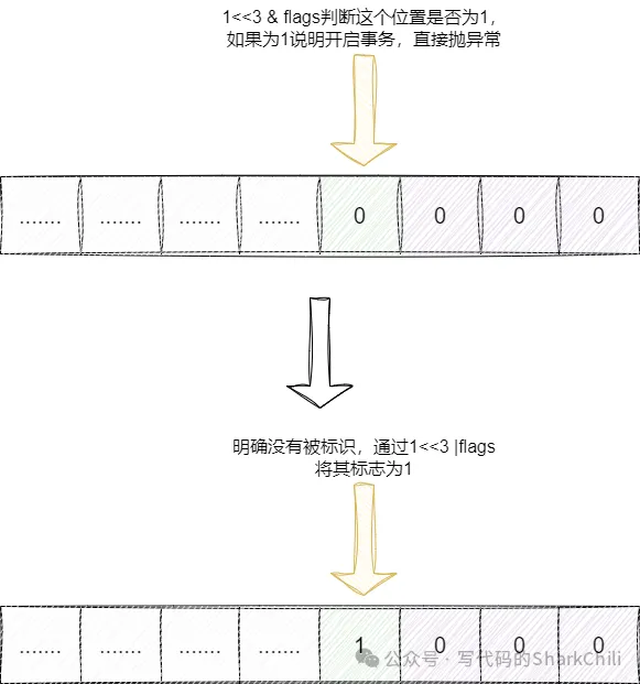 我们都知道redis开启事务需要multi指令,客户端键入该指令之后,redis首先就会通过按位与判断这个二进制为是否被标识为1,如果是则说明已经开启事务,直接抛出嵌套事务异常告知客户端不可重复调用multi指令,反之通过或运算将其设置为1:
