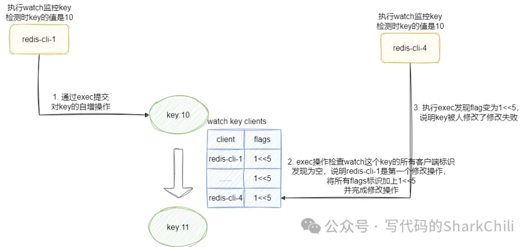 我们客户端1提交时,因为之前没有客户端进行修改,所以成功提交修改操作,并将watched_keys中监听key的所有客户端的flags标识为已被CAS修改即枚举变量REDIS_DIRTY_CAS数值为1<<5。 然后客户端2进行修改操作时,看到自己的flags被修改为REDIS_DIRTY_CAS就知道了当前key被人修改了,所以乐观修改操作失败: