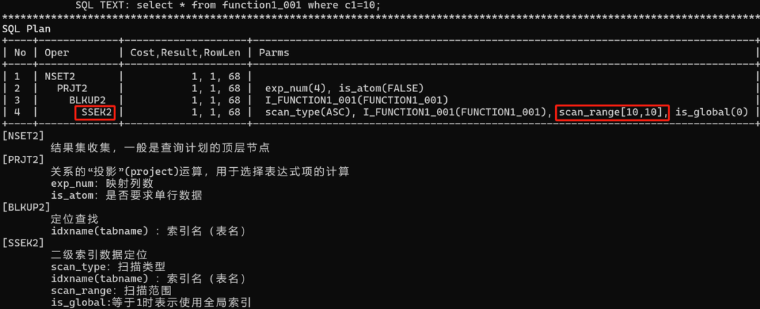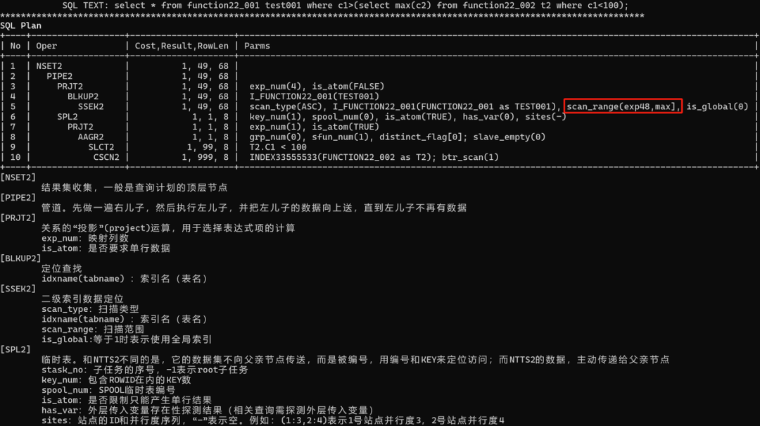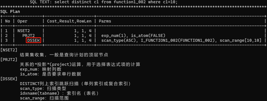 针对索引的单值查询,达梦数据库实际走的也是索引唯一扫描,不同的是操作符都是SSEK,可根据扫描范围scan_range属性来判断是否范围还是单值定位,如下图一。对于带有DISTINCT的查询,则会使用DSSEK操作符,扫描到第一个KEY,会跳过重复值就直接找到下一个KEY,如下图二。