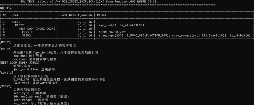 针对索引跳跃扫描,达梦数据库并不是一个操作符完成,而是通过 NLIJ+CONSTC+SSEK 组合完成。下图中是针对两个列创建的复合索引,然后根据索引第二列进行查询的情况。关键字CONSTC明确指出其采用了复合索引的跳跃扫描。
