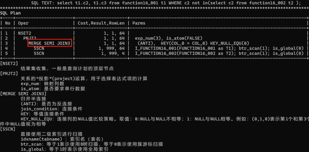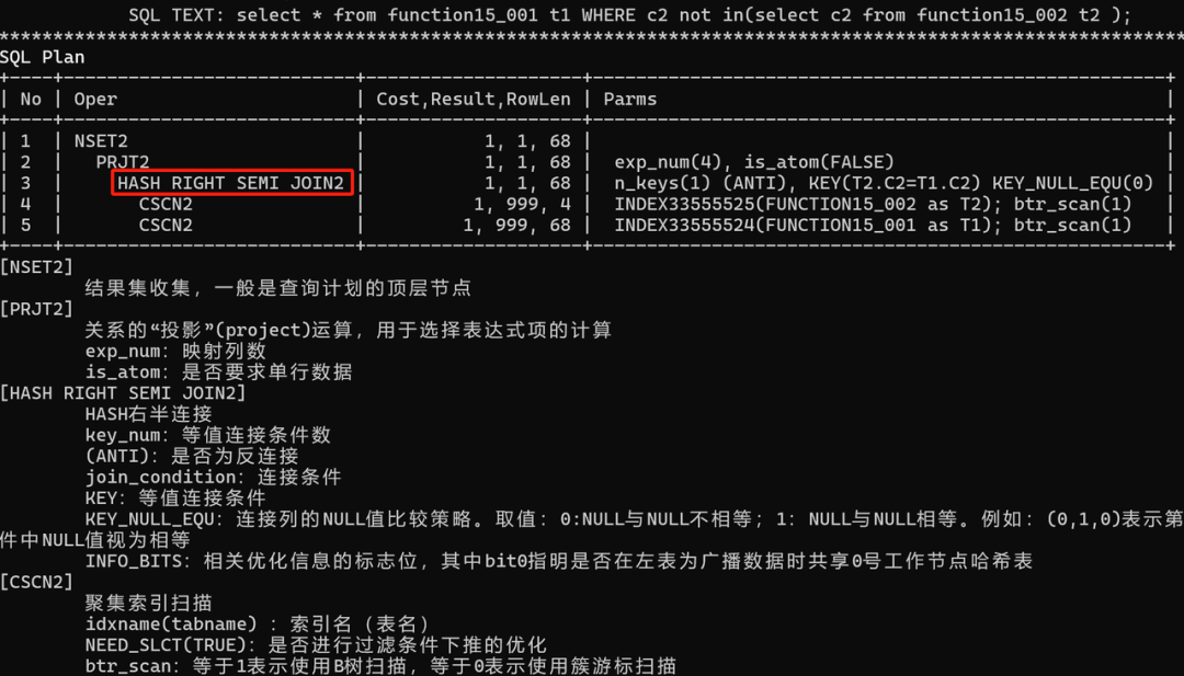 在反连接上,达梦数据库会转换为半连接方式处理,也会使用到HJ、SM等;但对于Null Aware的连接,还存在不足,尚不支持单独算子,如下图三。
