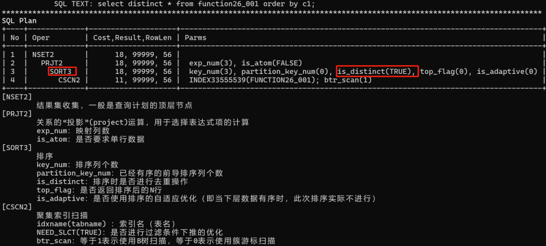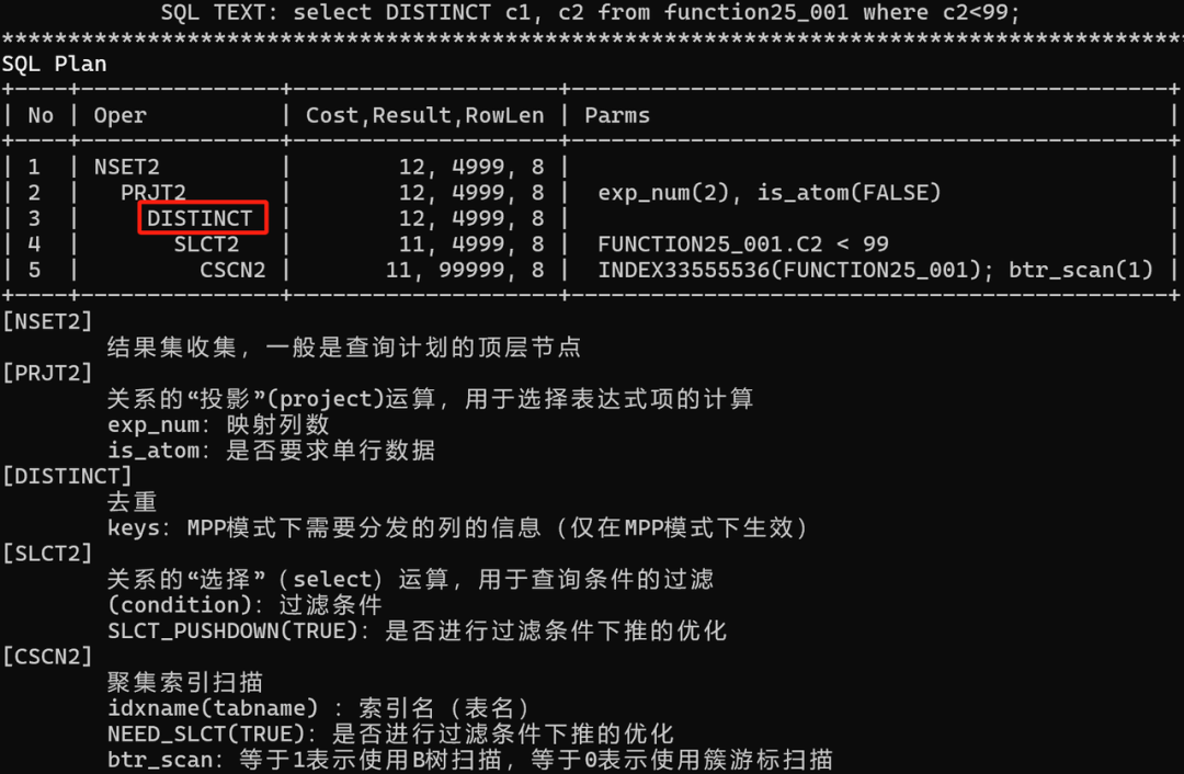 对于排序合并中,达梦数据库针对去重使用DISTINCT操作符完成,内部实现也是基于HASH UNIQUE,如下图一。针对排序去重场景,则使用了SORT3实现排序,并在过程中实现去重。