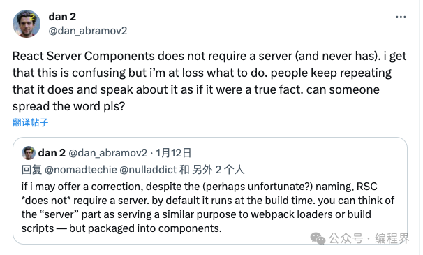 Dan 在 Twitter 解释了这一行为:“React Server Components(RSC)并不需要一个服务器。默认情况下,它在构建时运行。你可以将 “服务器” 部分看作类似于 webpack 加载器或构建脚本的作用 —— 但打包到组件中”。引来了大量的讨论。