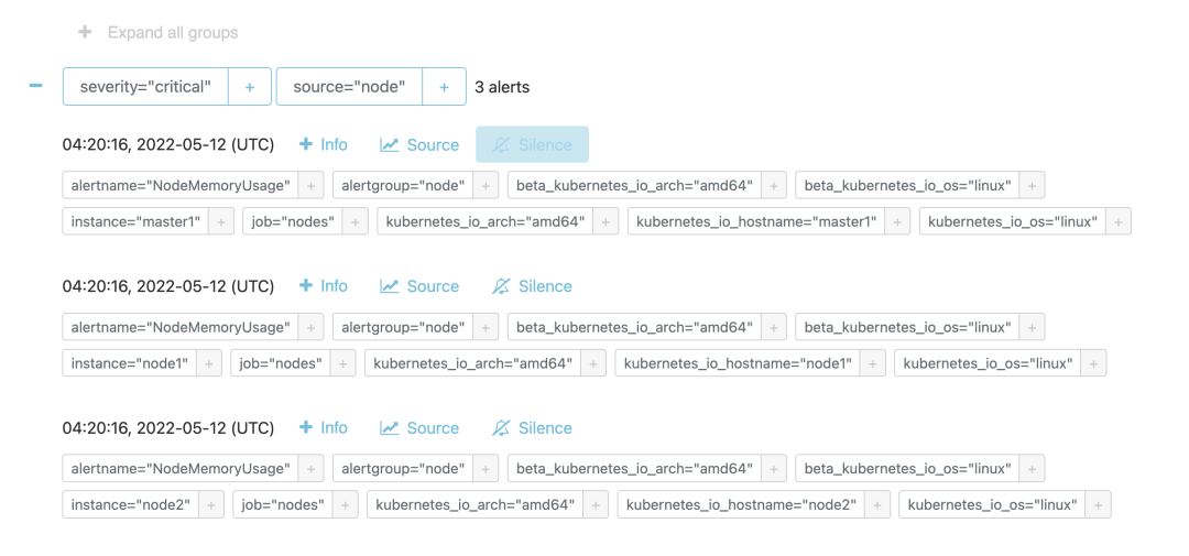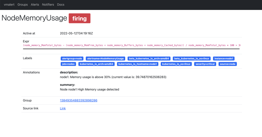 vmalert NodePort 10.104.193.183 <none> 8080:30376/TCP 22m1.2.3.4.5.6.7.8.9.10.11.12.13.14.15.部署成功后,如果有报警规则达到了阈值就会触发报警,我们可以通过 Alertmanager 页面查看触发的报警规则: