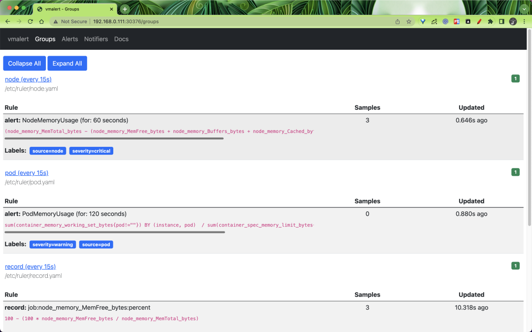 同样 vmalert 也提供了一个简单的页面,可以查看所有的 Groups: