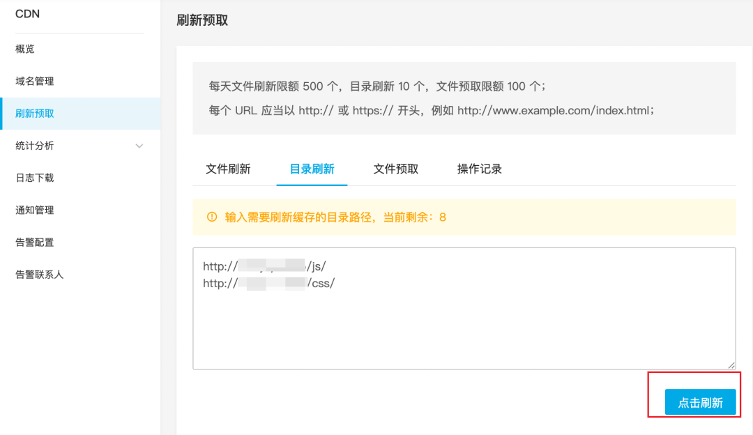 另外需要注意的是如果覆盖上传了文件到自己的对象存储后,则需要刷新下 CDN,不然网站加载的文件还是之前上传的,导致网站上看不到改动的效果。如下图所示的刷新界面,填入刷新的目录,点击刷新就可以了,不过有刷新限制,不要频繁刷新。