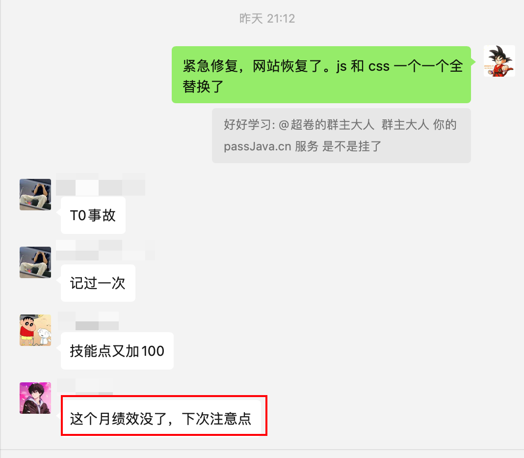 好了,经过 2 个小时的紧急修复:下载文件、修改 js 脚本、上传文件、刷新 CDN、替换链接等一系列操作,我的小破站终于恢复正常了。赶紧在群里给读者反馈网站恢复了。但问题是读者们把我的这个月的绩效扣没了。。。