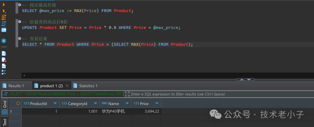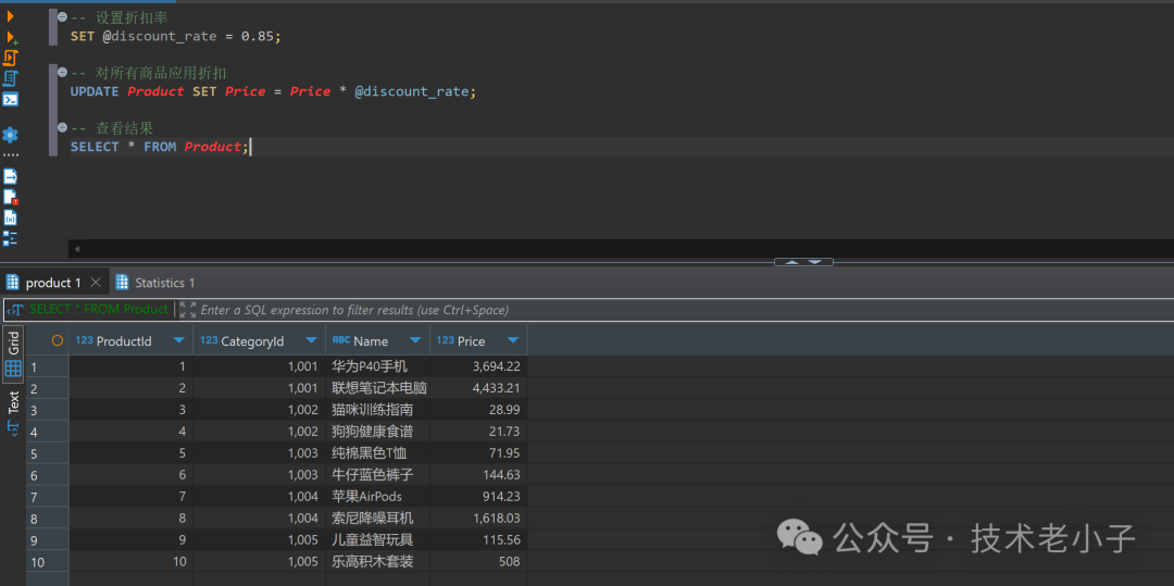 我们可以结合变量和表操作来实现更灵活的价格调整: