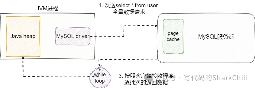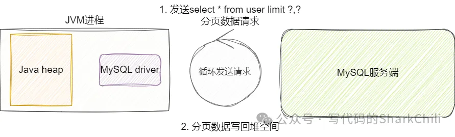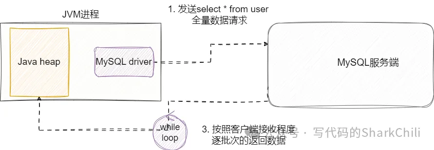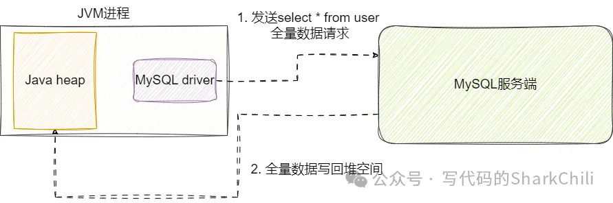 我们先来说说全量查询,这种方案本质原理就是一次性将结果集从MySQL服务端写到客户端程序上,针对大表数据检索,如果我们的程序没有足够的堆内存空间,存在内存溢出的风险: