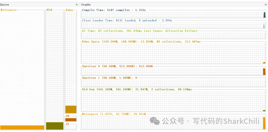 我们通过jstat指令查看堆内存使用情况,触发了6次full gc,整体回收花费了6s,性能表现非常差劲: