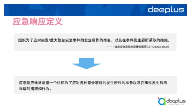 应急响应的概念较早来源于《信息安全应急相应计划规范GB/T24363-2009》中提到的安全相关的应急响应,整体定义是“组织为了应对突发/重大信息安全事件的发生所作的准备,以及在事件发生后所采取的措施”。从这个概念我们延伸到稳定性上就产生了新的定义,“一个组织为了应对各种意外事件的发生所作的准备以及在事件发生后所采取的措施和行为”。这些措施和行为,通常用来减小和阻止事件带来的负面影响及不良后果。