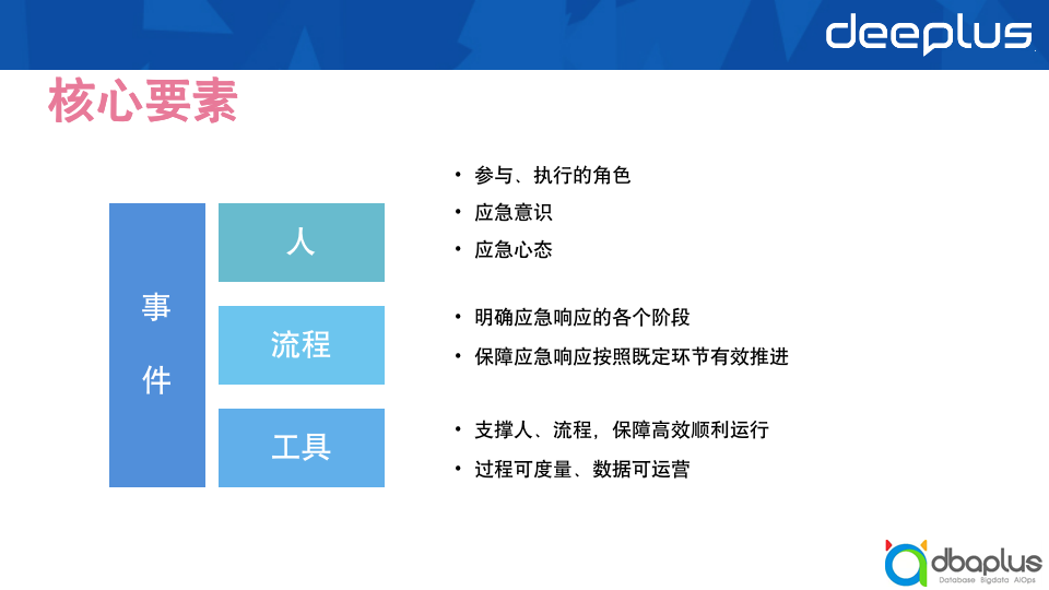 做好应急响应工作的核心目标是提升业务的稳定性。在这个过程中,我们核心关注4大要素。核心点是事件,围绕事件有三块抓手,分别是人、流程和工具/平台。