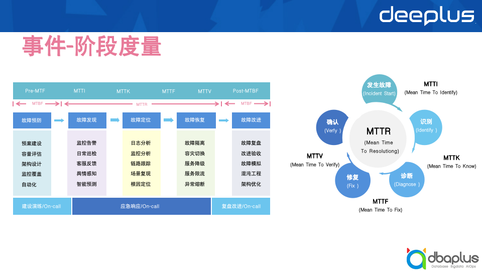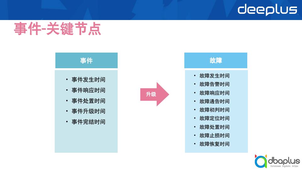 MTTI:平均故障发现时间,指的是故障发生到我们发现的时间。MTTK:平均故障定位时间,指的是我们发现故障到定位出原因的时间。MTTF:平均故障修复时间,指的是我们采取恢复措施到故障彻底恢复的时间。MTTV:平均故障修复验证时间,指的是故障恢复之后通过监控、用户验证真实恢复的时间。3)关键节点