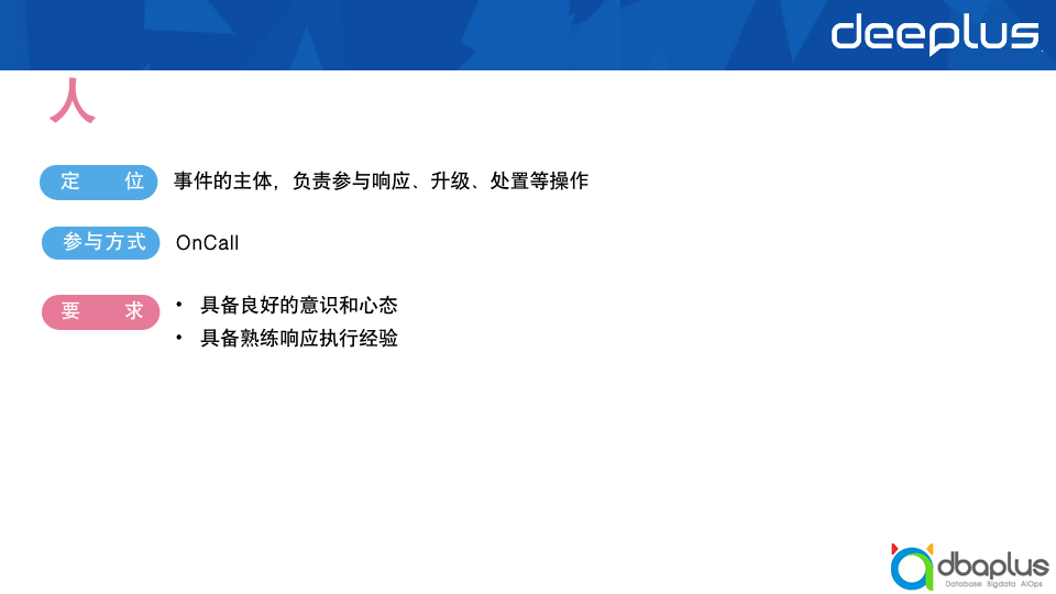 人通过上文中我们讲到的OnCall参与到应急响应中。我们在内部通过一套OnCall排班系统进行这方面的管理。这套系统明确了内部的业务、职能和人员团队,确保人员知道什么时间去值什么业务的班。下面的工具/平台部分会展开介绍。对参与人的要求,主要有以下几点: