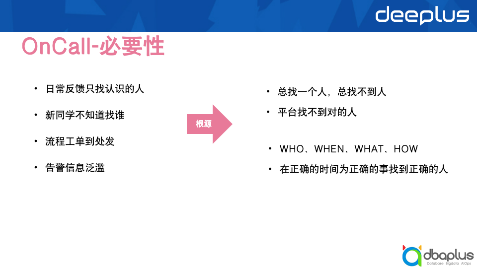 在日常工作中,当我们使用公司某个平台功能时,可能会习惯性找熟悉的同学,不管他这一天是不是oncall。这可能给那位同学带来困扰,他可能上周才值完班,这周要专心于研发或者项目的推进,你随时找他可能打断他的工作节奏。还有一种情况是新同学不知道该去找谁,我们内部之前经常有这种情况,一个新来的同学接手一套系统之后,有问题不知道该找谁,经常要转好几手,才能找到对的人,这一过程很痛苦。