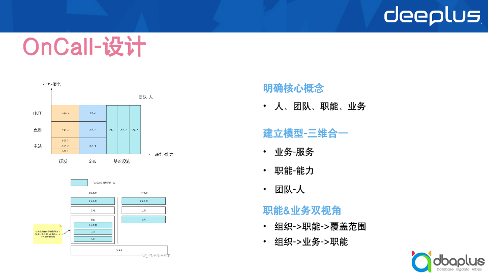 我们构建起了一套三维合一的模型。由组织-业务、职能-人员、组织-职能的关联关系,产生交汇点。值班人员会通过值班小队的方式,落在这些交汇点上,并且基于业务和基础架构的异同点,通过业务视角和职能视角分别对外提供服务。