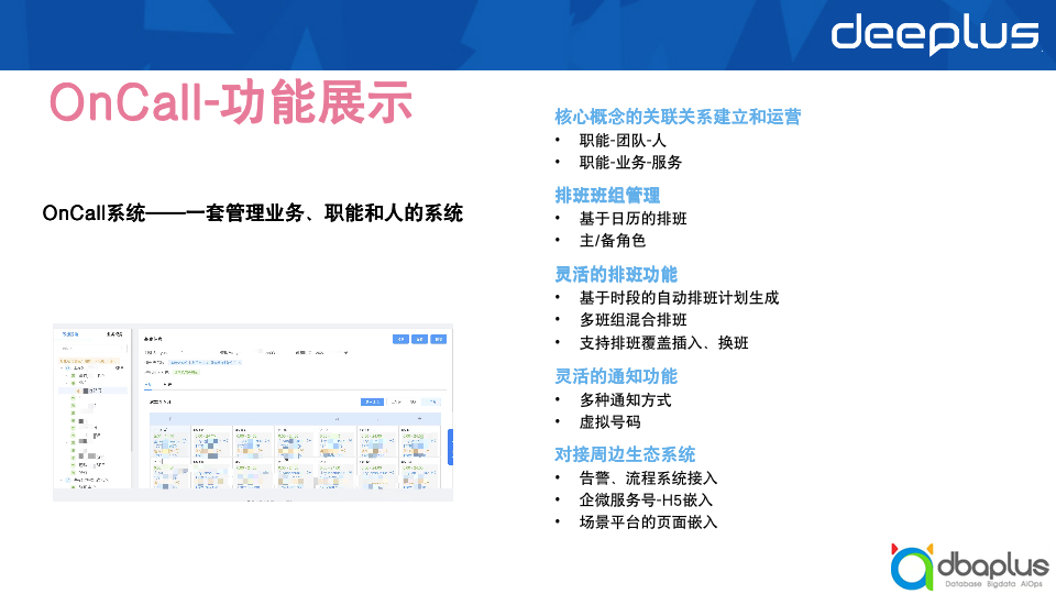 在周边生态方面,这套OnCall系统完全依赖周边系统的接入。我们目前对接了内部的告警系统、流程系统,确保告警和流程能够只通知oncall人,而不形成骚扰。在企业微信的服务号中,也进行了H5的页面嵌入,在用户通过企业微信反馈问题、找人时,知道当下该找谁。在各个接入的平台,也内嵌了OnCall的卡片页面,明确告诉用户本平台当前是谁值班。通过这套OnCall系统的落地,我们明确了人、团队、职能和业务的概念,并将这些概念进行了关系建立和对应。人员通过排班班组统一对外为某个业务提供某项职能的值班响应。通过前端的可视化,提供了日历的值班展示效果,可以直观看到某个业务所需要的某块职能在某个时间点是由哪个班组在服务,周边的各个系统也都对接OnCall系统,实现了人员响应的统一管理,解决了某些人员认人不认事,不通过正规流程处理的问题。