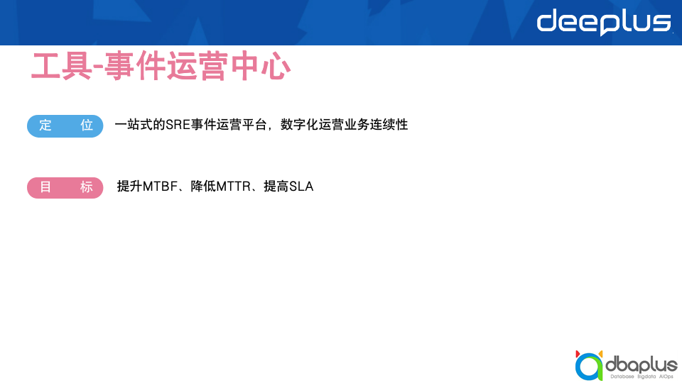 事件运营中心这套系统是我们基于ITIL、SRE、信息安全应急计划的事件管理体系,为了满足公司对重大事件/故障的数字化管理,实现信息在线、数据在线和协同在线,使组织能够具备体系化提升业务连续性能力所做的产品平台。这个平台的定位是一站式的SRE事件运营中心,数字化运营业务连续性的目标是提升MTBF,降低MTTR,提高SLA。