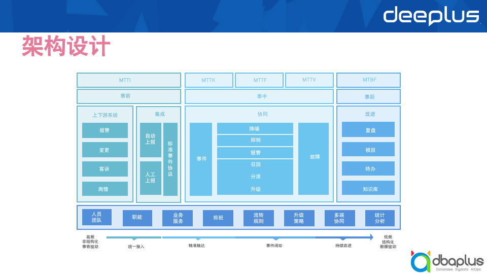 在故障结束之后,就进入到我们整体的改进环节。平台可以基于故障一键创建复盘报告,自动关联故障处理过程中的专家数据。平台提供预制的故障复盘问答模板,以确认各阶段是否按照预期的目标进行。复盘产生的待办列表,平台会进行定期的状态提醒和处理进度跟进。最终的这些都会以知识的形式,沉淀在我们的知识库。帮助日常On-Call问答和公司内部员工的培训学习。整体这样一套平台流程下来,就实现了将一些日常高频的非结构性事务驱动,通过统一接入、精准触达、事件闭环和持续改进等环节,转化为低频的结构化数据驱动方式。