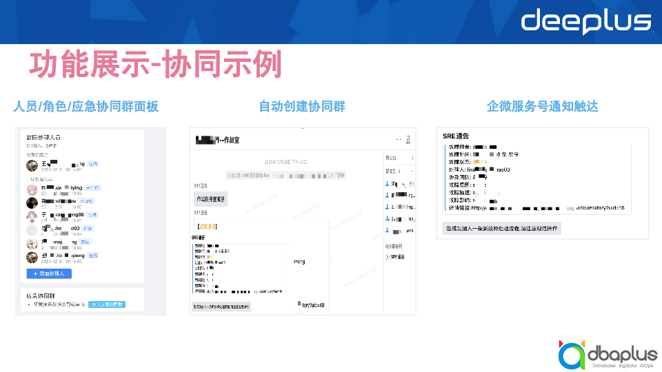 上图中是协同相关的一些示例,当一个故障被创建出来时,会自动关联该故障涉及到的业务、组件、基础设施的oncall同学,这些同学可能是SRE、研发等,平台会记录他们是否有响应这些问题,并且当下所负责的角色是什么。因为角色决定了在该事件中所担负的事项和责任;下方一键拉群,可以将相关人员,自动拉入到一个群内,方便大家进行沟通协同,并且事件、故障的相关最新进展也会定期在群内同步;涉及到事件的参与人员,事件运营中心的服务号也会定期推送最新进展,确保不会丢失消息。