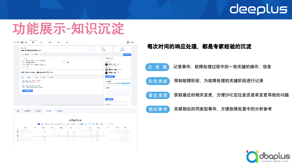 上图是我们内部的故障协同的详情页面,提供了记录簿、故障阶段更新、最近变更信息和相似事件,确保每次的响应处理,都能形成一个专家经验的沉淀,帮助后续新来的同学进行故障响应过程的学习。
