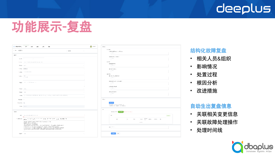复盘方面,我们定义了结构化的故障复盘模板,像相关人员、组织、影响情况、处置过程、根因分析(在根因分析里面,我们设置了6问,确保对问题能够有深度地挖掘),改进措施等。在复盘效率方面,我们关联了相关的变更信息、故障处理时的一些变更操作,以及处理时间线,帮助复盘同学快速生成故障的相关信息,减少人工录入负担。