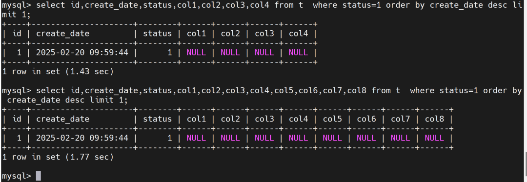 -- 查询三个字段 select id,create_date,status from t where status=1 order by create_date desc limit 1; -- 查询所有字段 select * from t where status=1 order by create_date desc limit 1;1.2.3.4.5.