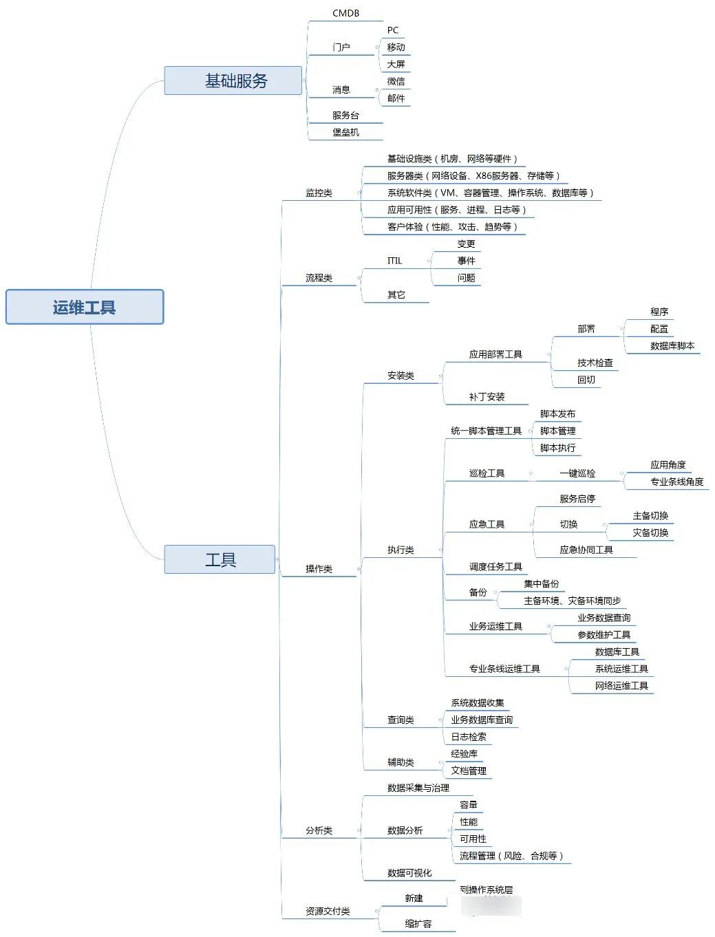 关于这些互联网企业的自动化对日常运维工作真实的覆盖面暂时无法考究,但以我的经验看,至少金融企业的自动化覆盖面还有很长的路要走,且肯定还会很大一部分工作很难自动化,毕竟工作类型太多,在有限的投入上只能集中力气去做投入产出比更高的运维自动化。这里再以一个运维工具思维导图(图1.3)简单列示一些常规的运维操作,可以看出其实很难有一套能解决所有运维操作的工具平台。