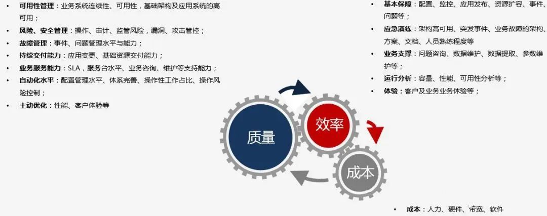 外部监管要求长期以来,为了防范金融风险,监管机构对金融企业保持强监管的方式,十九大之后,监管对金融企业的信息技术的稳定性、规范性有增无减。在强监管下,信息系统的稳定性有了进一步保证,但也给运维组织带来更高的要求,客观上也加大了工作量,并由于规范流程带来的工作效率的下降。