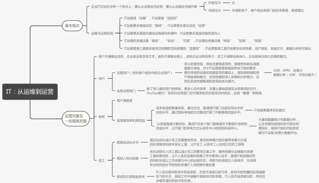 1)理论优锘科技CEO的陈傲寒在2016年写过一篇文章《IT:从运维到运营》,仍是我读过最好的一篇。全文从企业、运维组织角度出发分析什么是运维、什么是运营,再将运营分解到不同角色上的理解与落地的方向,全文均是干货,值得通读,这里只列出一个思维导图。