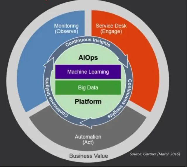 AIOps这个词最早是在2016年由Gartner提出(当然国内很多厂商也提出它们早几年也提出了这个理念)。AIOps是Algorithmic IT Operations的缩写,是基于算法的IT运维,即通过使用统计分析和机器学习的方法处理从各IT设备、业务应用、运维工具收集的数据,从而加强增强运维自动化能力,以便更快、更有效、更全面地自动化效果。以下是Gartner提出AIOps的一张图:
