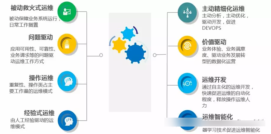 1)特点被动救火式,以被动保障业务系统运行,日常计划性工作容易被打断、搁置;问题驱动式,以系统可用性、可靠性、业务请求等问题驱动运维工作;操作运维,重复性、操作类点主要工作量的运维模式;经验式运维,由人工经验驱动的运维模式,尤其是一些经验丰富的老员工的离职在短期内会对运维质量带来一定的冲击。2)转型从被动救火式向主动精细化转型,专业化分工、主动分析,主动优化,驱动开发,促进DEVOPS的落地;从问题驱动向价值驱动转型,以企业业务发展目标为主线,业务体验、服务满意度、促进业务更好发展;从操作运维向运维开发转型,通过为运维人员提供运维开发平台,降低运维开发门槛,快速落地一些紧迫的运维工具,降低操作性、重复性的运维工作;从依靠经验向智能化驱动运维转型,结合数据分析、知识库、机器学习技术促进运维智能化。图1.10
