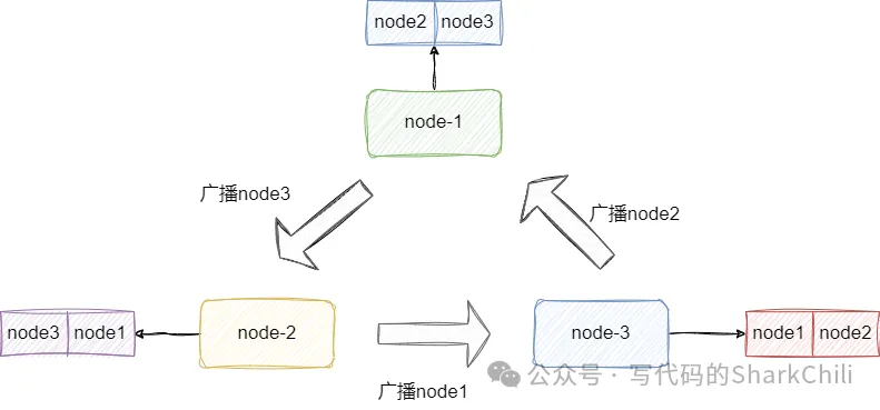 我们以一个简单的场景为例介绍一下Gossip协议,默认情况下我们的当前有3个节点的集群,各个节点彼此按照通信要求发送自己的信息和与自己保持交流的节点,由此将有限的资源共享出去构成一个集群。